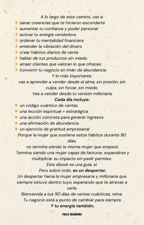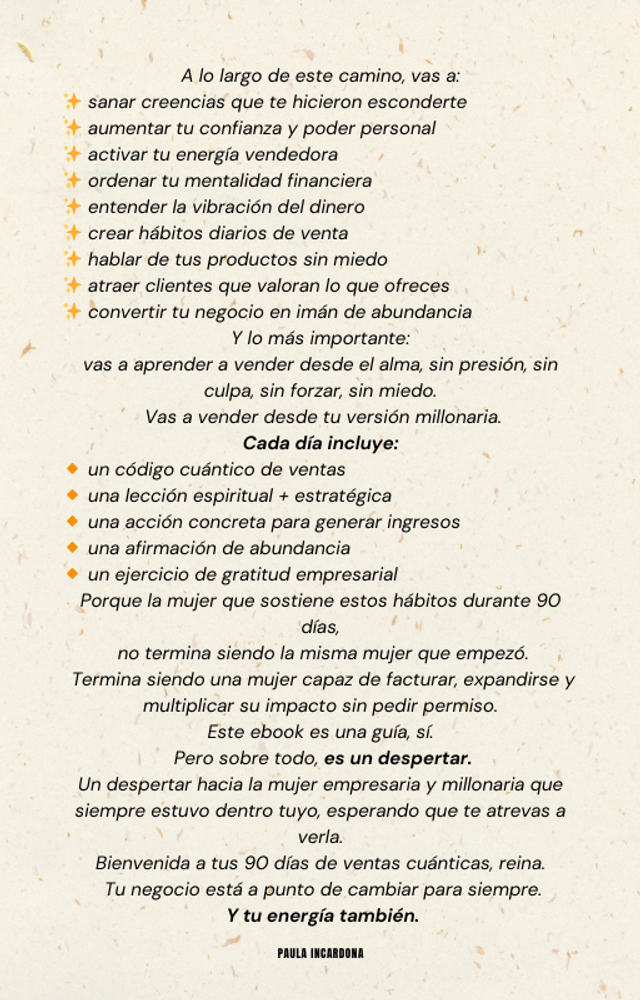 Durante 90 días consecutivos vas a trabajar desde adentro hacia afuera, transformando primero tu identidad y tu energía, para que luego las ventas se manifiesten de forma natural y sostenida.
