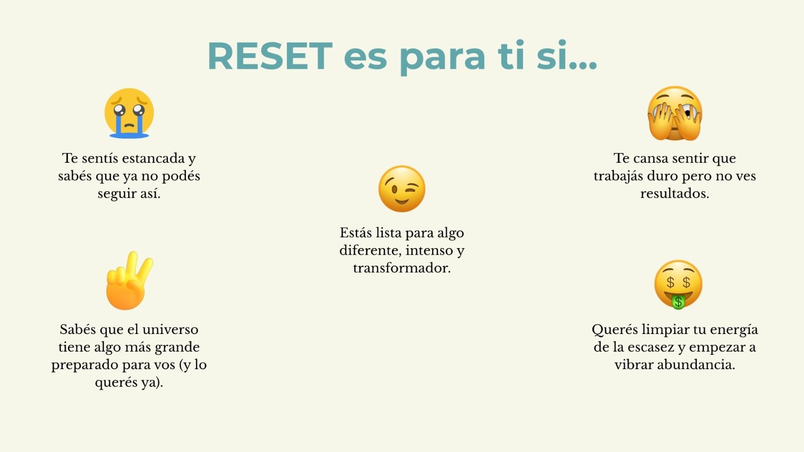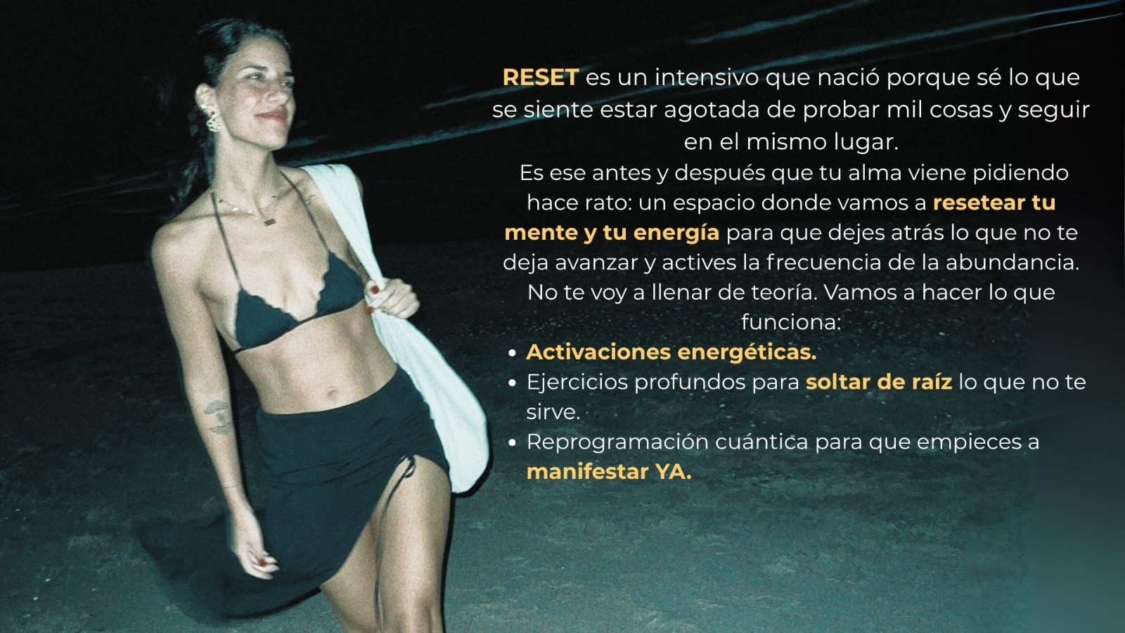 Este intensivo no es teoría acumulada ni un programa más para guardar en tu carpeta de pendientes. RESET es un cambio trascendental en tu vida: en tu energía, en tu mente y en tu capacidad de manifestar abundancia.